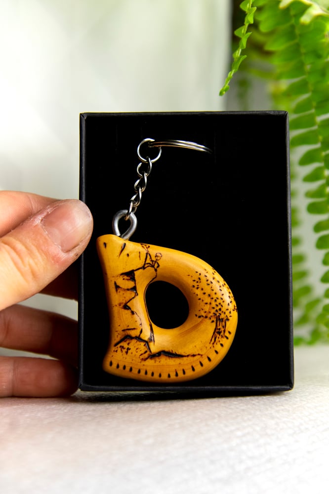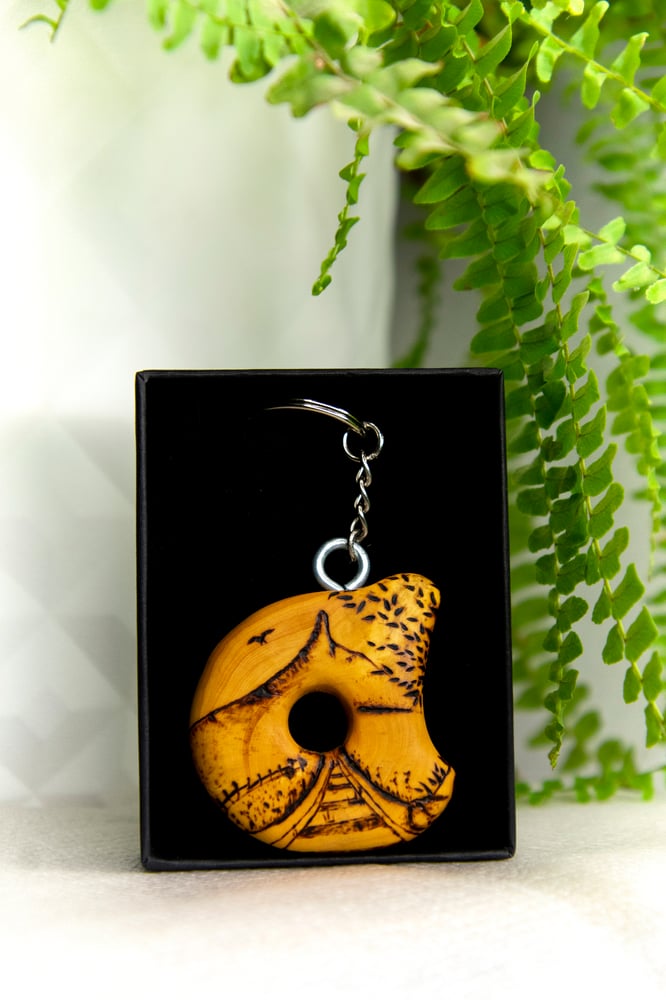 Llavero de madera hecho a mano y pirograbado con motivos de Escalada y Montaña.