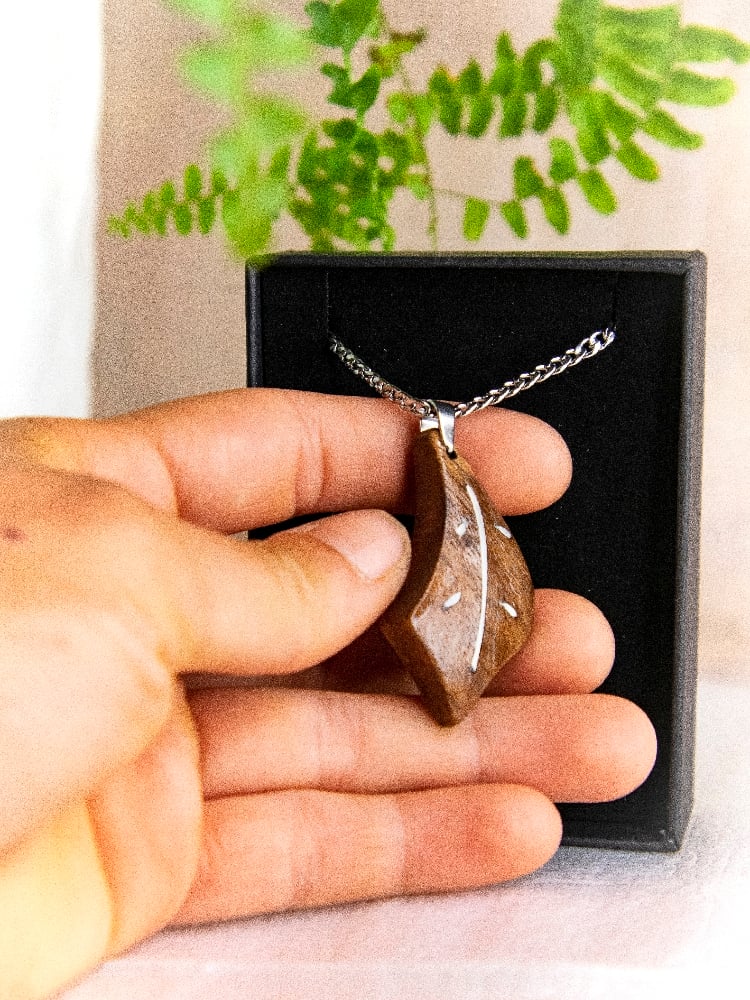 *COLGANTE INSPIRACIÓN* 🪚Hecho a mano en madera de nogal y acero incrustado. ⛓️Cadena de acero. ✨PIEZA ÚNICA, 🌿Un diseño elegante con inspiración en el mundo vegetal.