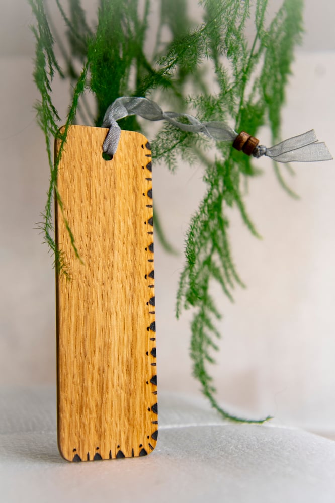 Marcapáginas en madera de Roble y pirograbado sencillo.